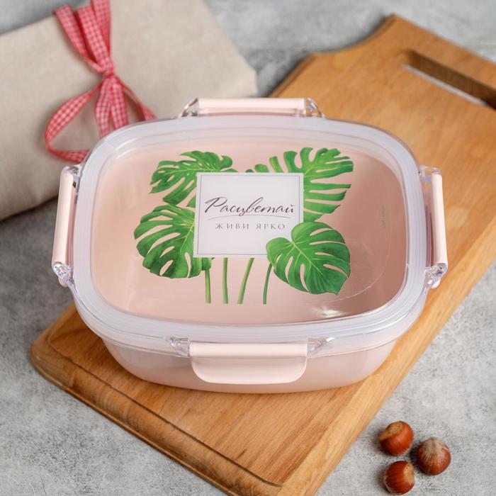 Контейнер "Расцветай и живи ярко", 800 мл. Герметичная крышка: Да. Материал: ПВХ, Пластик. Можно использовать в СВЧ-печи: Да. Набор: Нет. Объём, мл: 800. Размер: 21 см x 9 см x 17 см. Размер упаковки: 21 см x 17 см x 9 см. Рисунок: Да. Страна производителя: Китай. Тематика праздника: 8 марта. Форма: Прямоугольная. Цвет: Розовый, Зелёный. ---.(5284359)