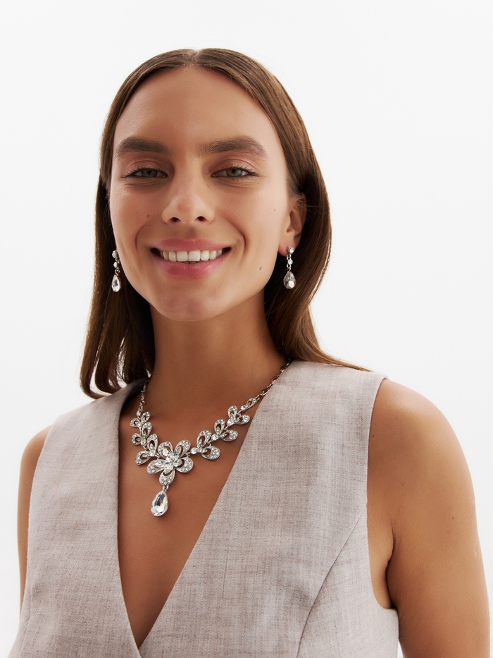 Набор из двух предметов: серьги и колье со стразами — это элегантный аксессуар с уникальным дизайном, который добавит сияния вашему образу. Этот комплект идеально подойдет для любого мероприятия, подчеркивая утонченность и стиль. Серьги и колье можно носить вместе или раздельно, дополняя образы для любого случая.