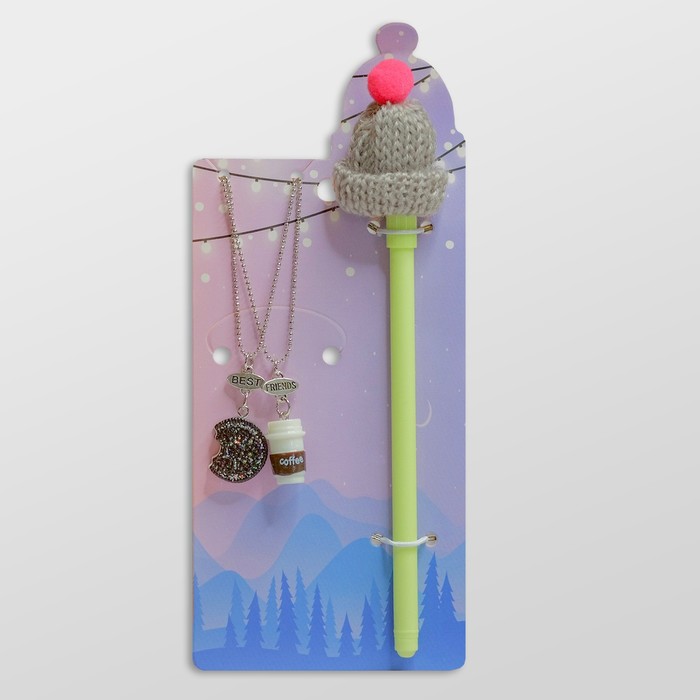 Набор 3 предмета: 2 кулона, ручка "Новогодний" кофе с печенькой, цветной.