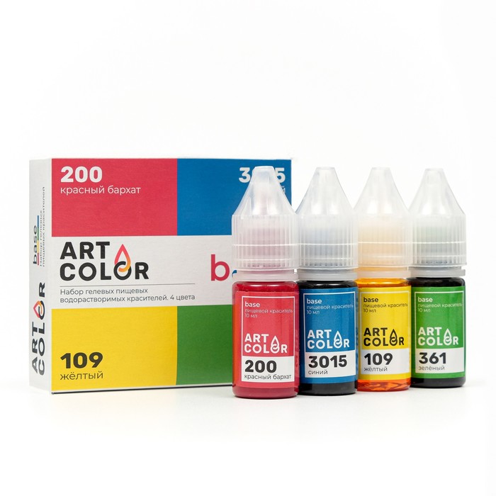 Набор гелевых водорастворимых пищевых красителей BASE от официального производителя бренда ART COLOR содержит 4 самых востребованных цветов: красный бархат, синий, желтый, зеленый. Цвета из линейки BASE отлично сочетаются друг с другом. Каждый краситель расфасован в новый удобный флакон 10 мл с мерным носиком и контролем первого вскрытия.