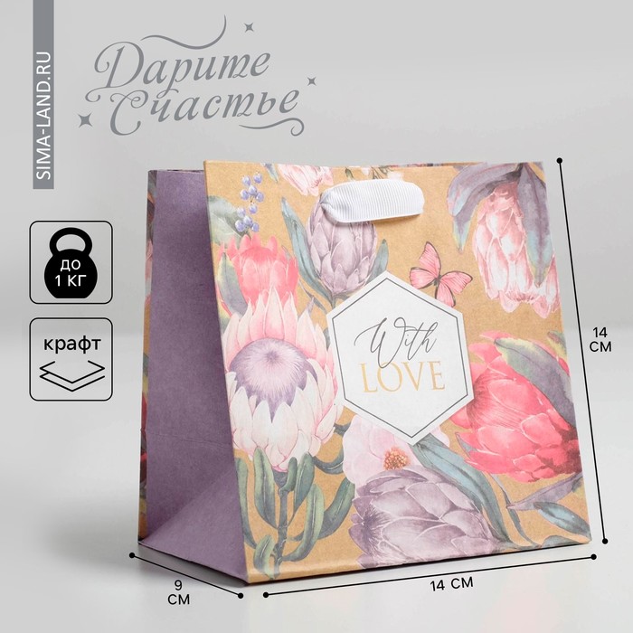 Пакет крафтовый квадратный With love, 14 × 14 × 9 см