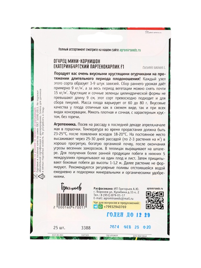 Семена Огурец Екатеринбургский Партенокарпик F1 25 шт. 12.29 г.