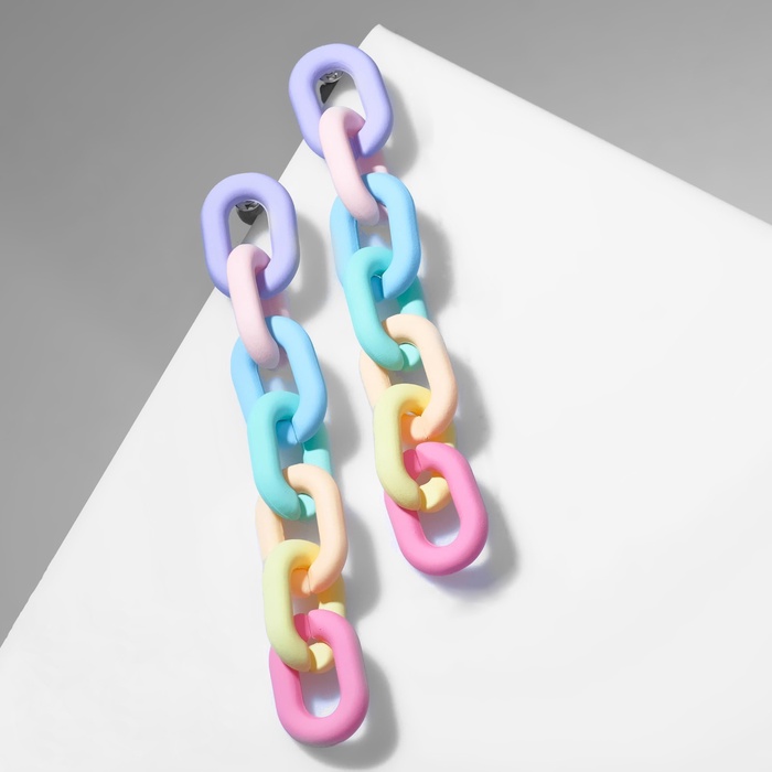 Стильные серьги-цепочки с семью разноцветными матовыми звеньями на серебристой металлической основе — современный аксессуар длиной 8,5 см для женщин. Лёгкий дизайн с пластиком делает украшение удобным для повседневного ношения и подчёркивает индивидуальность образа.
