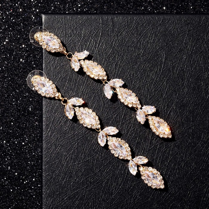 Серьги висячие со стразами "Цветы циркония" нить из листьев, цвет белый в золоте