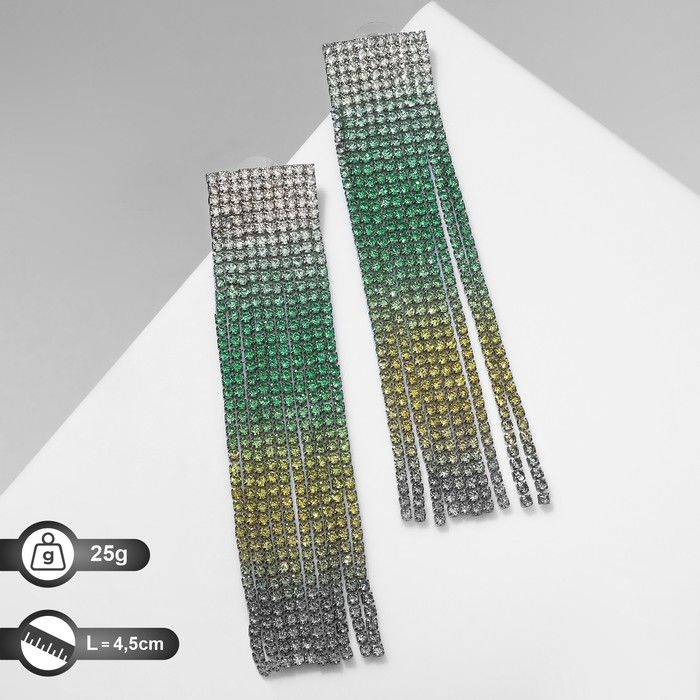 Серьги висячие со стразами "Водопад" градиент, зелёно-морские в серебре