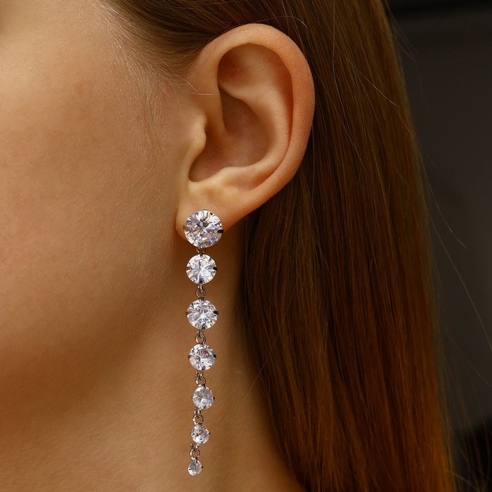 Изысканная форма и сияние белых фианитов в серебристой оправе создают эффектное украшение длиной 7,6 см, которое ловко обыгрывает тему изящества и динамики. Висячие серьги с оригинальным силуэтом «змейки» становятся выразительным акцентом, добавляя образу современности и лёгкой загадочности.