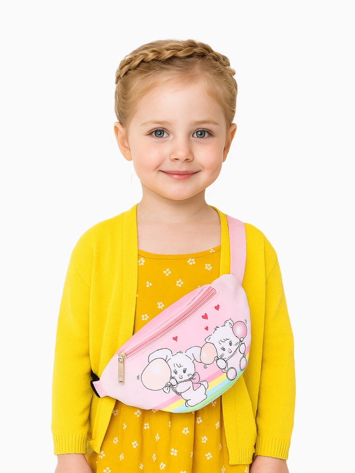 Представляем стильный аксессуар — детская поясная сумочка в нежно-розовом стиле, созданная специально для юных девушек. Сочетая трендовый дизайн и практичность, она станет незаменимой деталью повседневного образа девочки. Элегантный рисунок с изображением игривого зайца и котика добавляет неповторимое очарование, которое обязательно понравится юной моднице.
